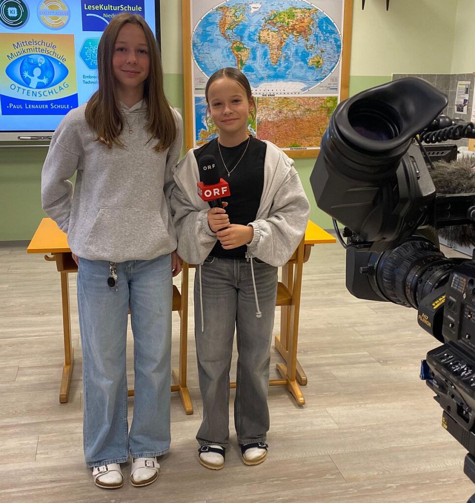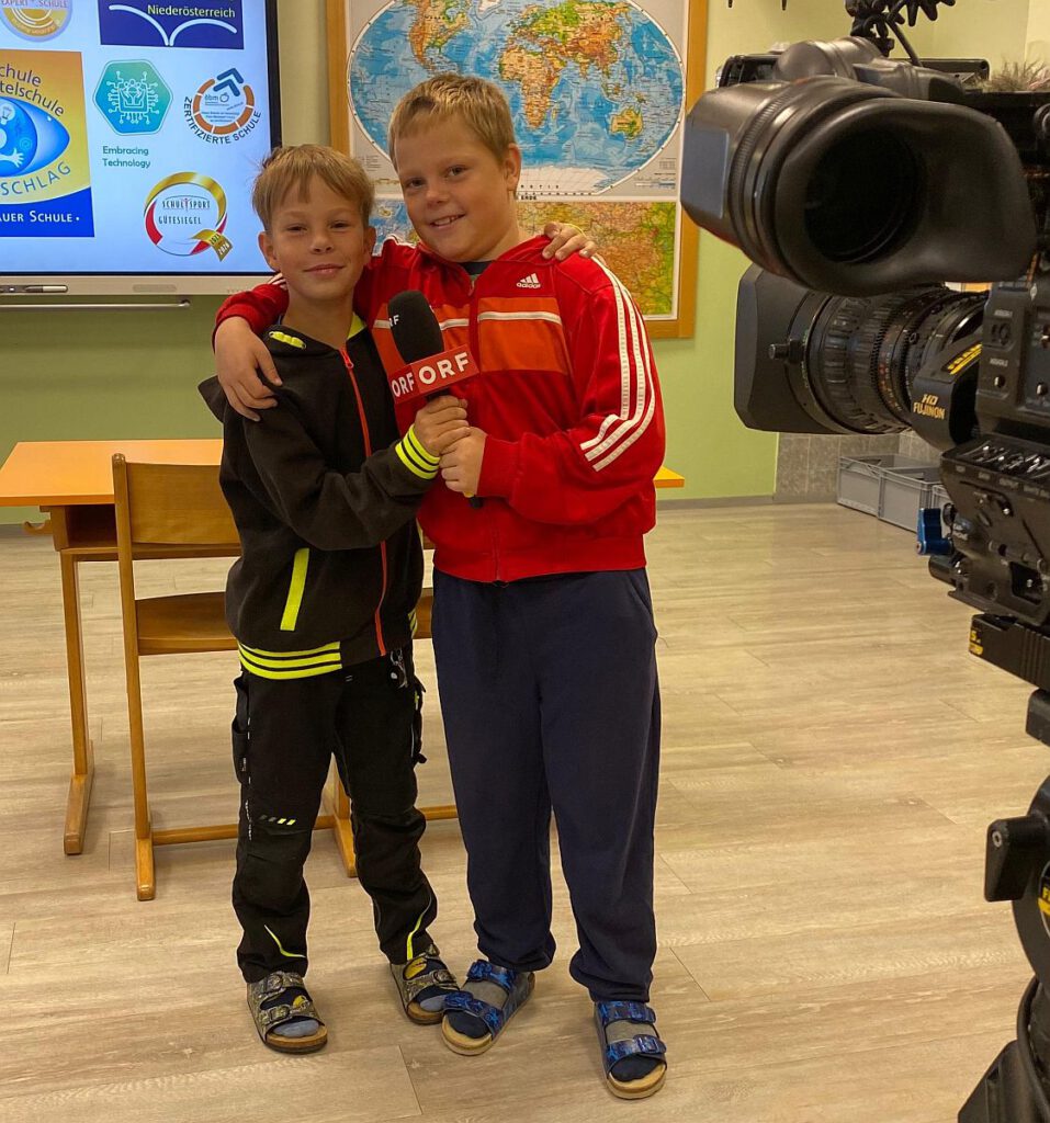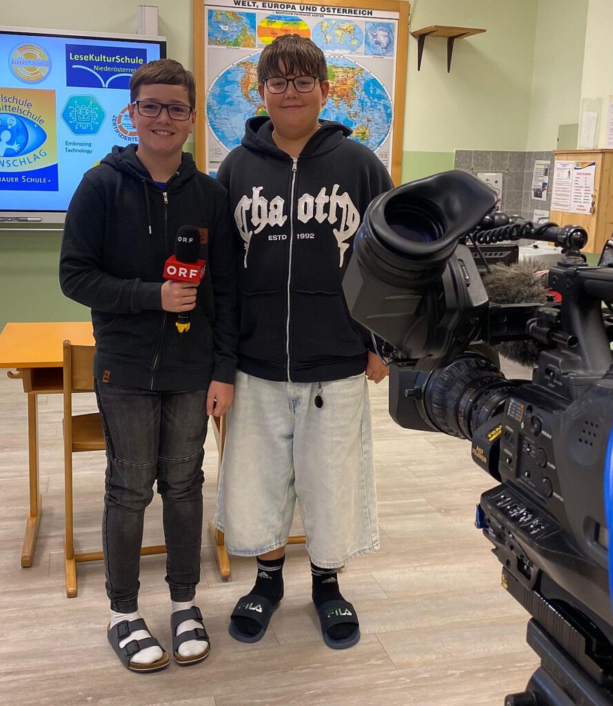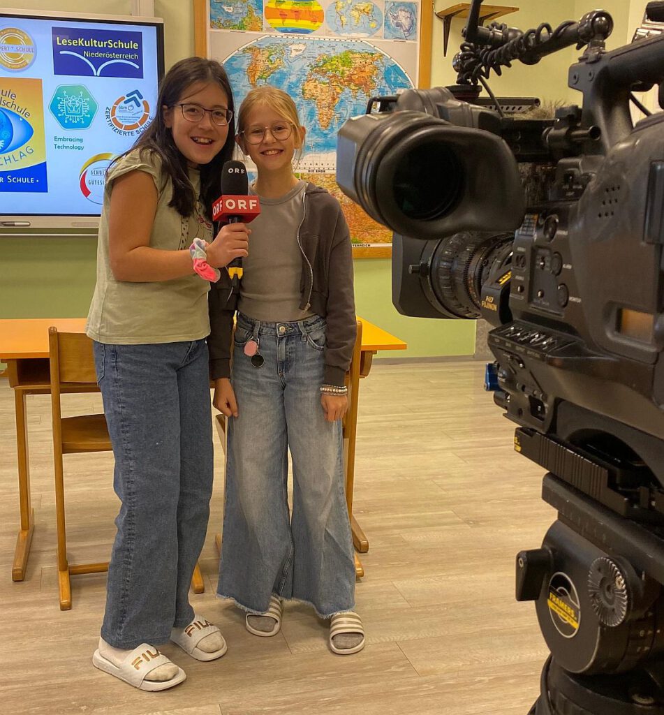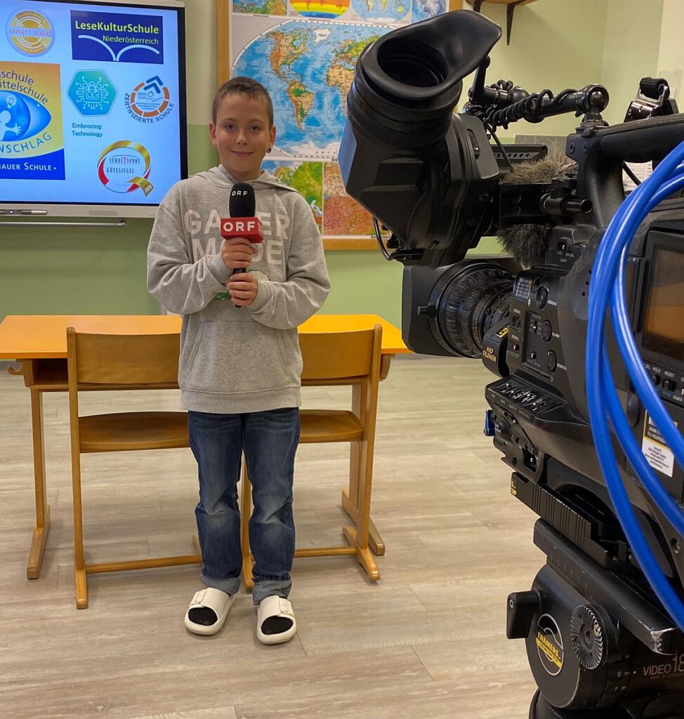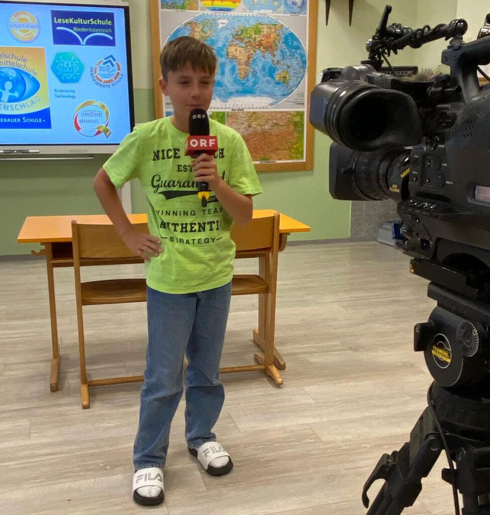 Bereits um 6 Uhr morgens besuchte uns an einem Mittwochmorgen im September ein Kamerateam des Landesstudios Niederösterreich, um mit unserer Schulleiterin in drei Live-Einstiegen für das bundesweit ausgestrahlte „Guten Morgen Österreich“ über KI in der Schule zu sprechen. In den Pausen zwischen diesen Einstiegen hatten die Schüler*innen Gelegenheit, ein bisschen Reporter zu spielen. Das war lustig 😉