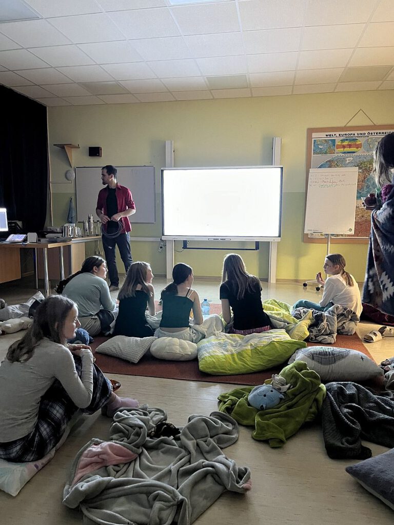 Anschließend wurde gemeinsam das Abendessen gekocht und Spiele und Essen kamen dabei nicht zu kurz. Ein Filmabend und eine kleine Geburtstagsfeier rundeten den Tag ab. Danach übernachteten die Peers im Peer-Raum der Mittelschule und setzten ihren Schulalltag am Freitag nach einem gemeinsamen Frühstück und einer Feedback-Runde fort.