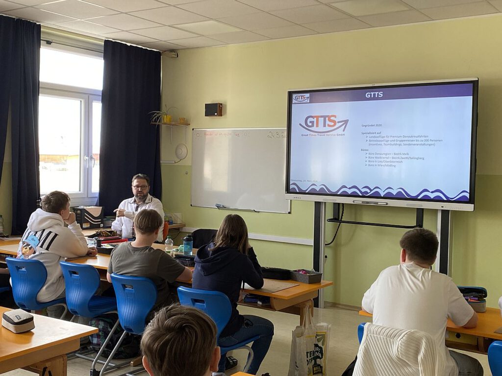 Im März besuchte Christoph Haider, Vater von Andreas Haider, Klasse 3 SM, den BBO-Unterricht und präsentierte seine Unternehmen GTTS (Great Times Travel Service). Dieses bietet Landausflüge für Donau-Kreuzfahrtschiffe zwischen Engelhartszell und Wien an. Interessant waren für unsere Jugendlichen die unterschiedlichen Berufe, wie z.B. Reisebürokaufmann*frau, aber auch die Verdienstmöglichkeiten. Danke für den sehr informativen Besuch!