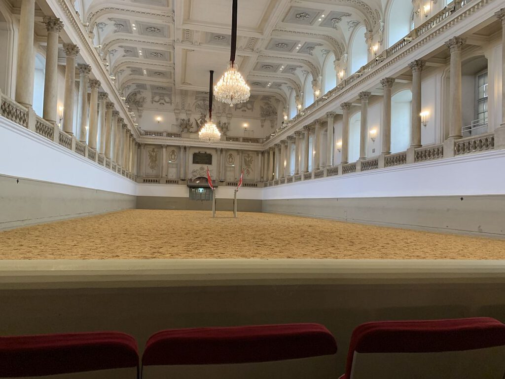 Nachdem wir die Mittagspause rund um den Stephansplatz beendet hatten, spazierten wir weiter zur Spanischen Hofreitschule, wo wir die wunderschöne Reithalle und die Stallungen der Lipizzaner sehen konnten. Wir erfuhren einiges über die lange Tradition der Schule und die aufwendige Ausbildung der Pferde.