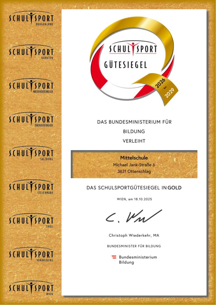 Unglaublich groß ist die Freude darüber, dass wir erneut mit dem Schulsport Gütesiegel in Gold ausgezeichnet wurden – und das mit Schwerpunkt Musik 😉. Diese Auszeichnung bestätigt die hervorragende Arbeit unserer Pädagog*innen, die mit ihrem qualitativ hochwertigen Sportangebot unsere Schüler*innen begeistern. Diese wiederum freuen sich über Morgen- und Mittagssport, über Dodgeball-Turniere, Fußball-Schülerliga, Schikurse, Sportwochen, Mailauf, über den Schachunterricht, über außergewöhnliche Angebote während der Projekttage und vieles mehr.