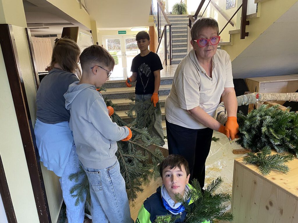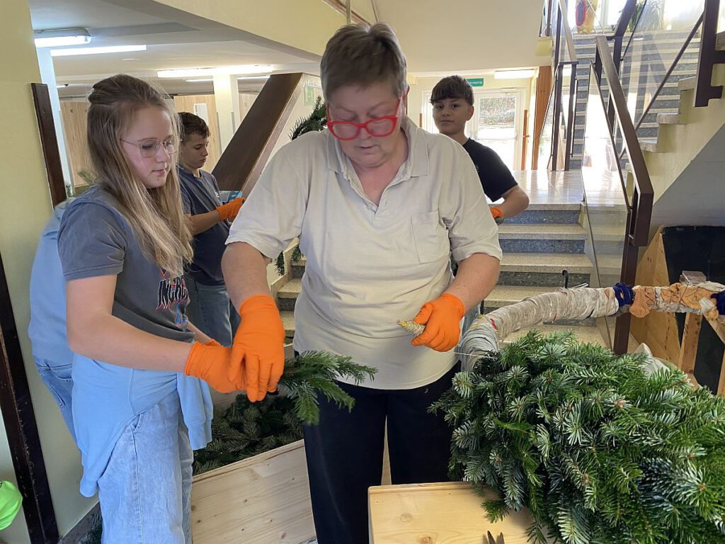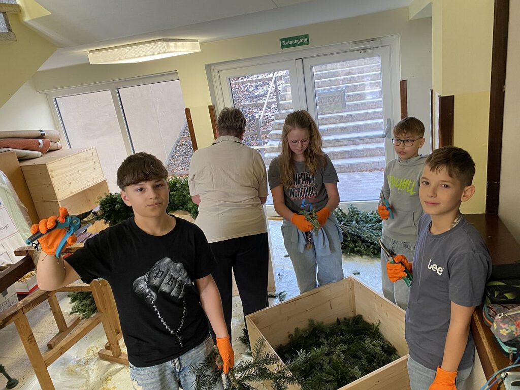 Maria Eigner und Maria Eckl flochten gemeinsam mit einigen Schüler*innen das vom Christbaumbauer Köck aus Bernhardshof gespendete Reisig zu diesem beeindruckenden, wunderschönen Kranz.